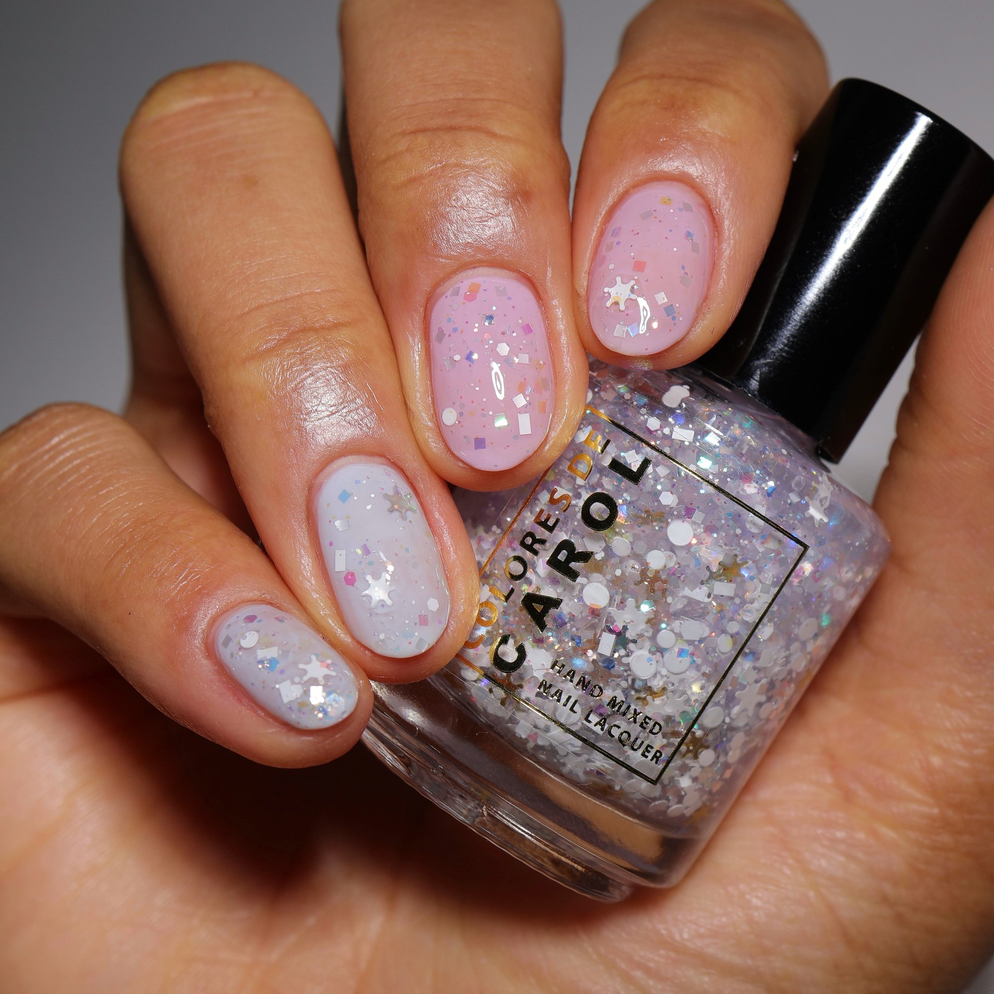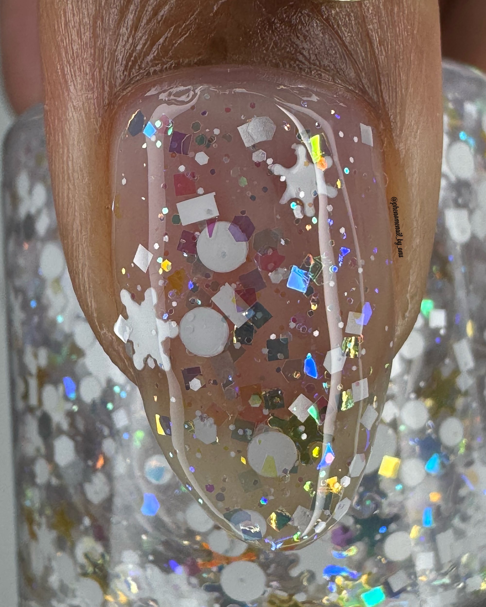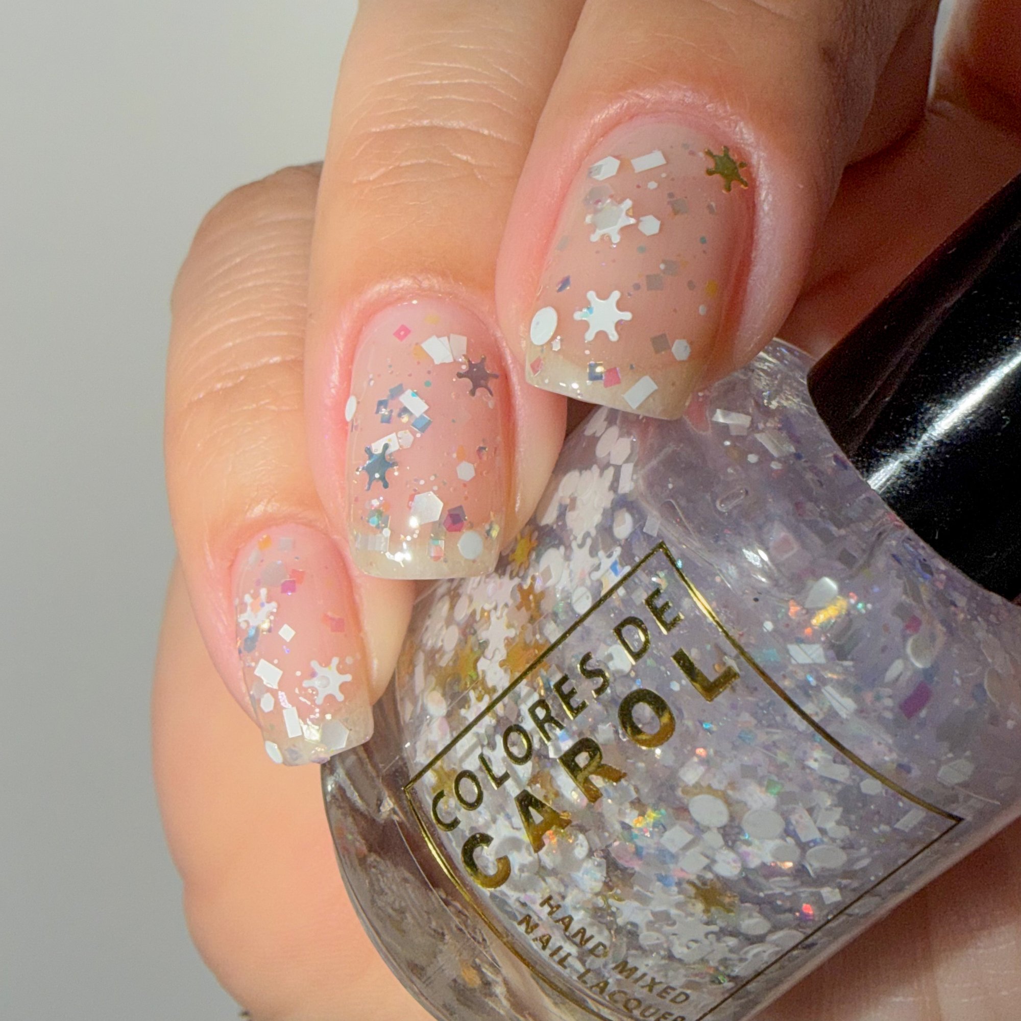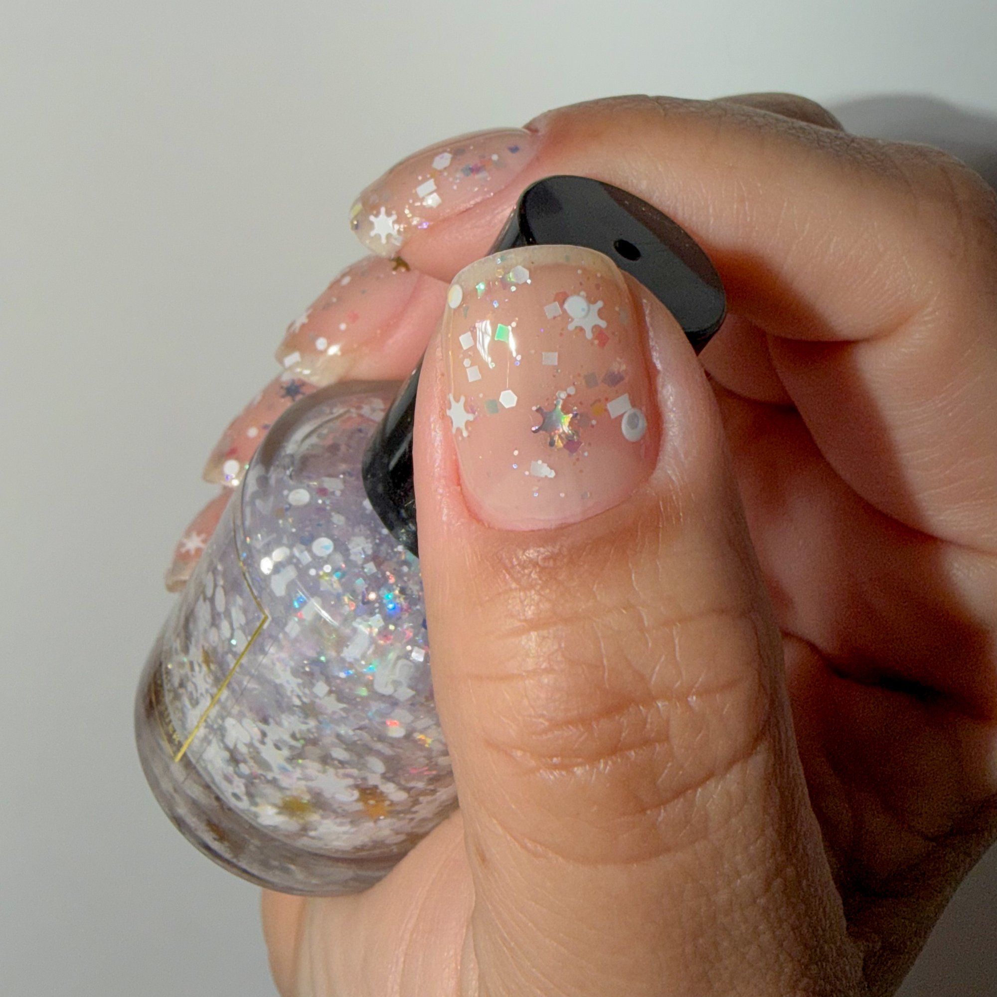 BALANCE - (topper) a clear base with white glitter in various shapes and sizes and iridescent chameleon glitter.