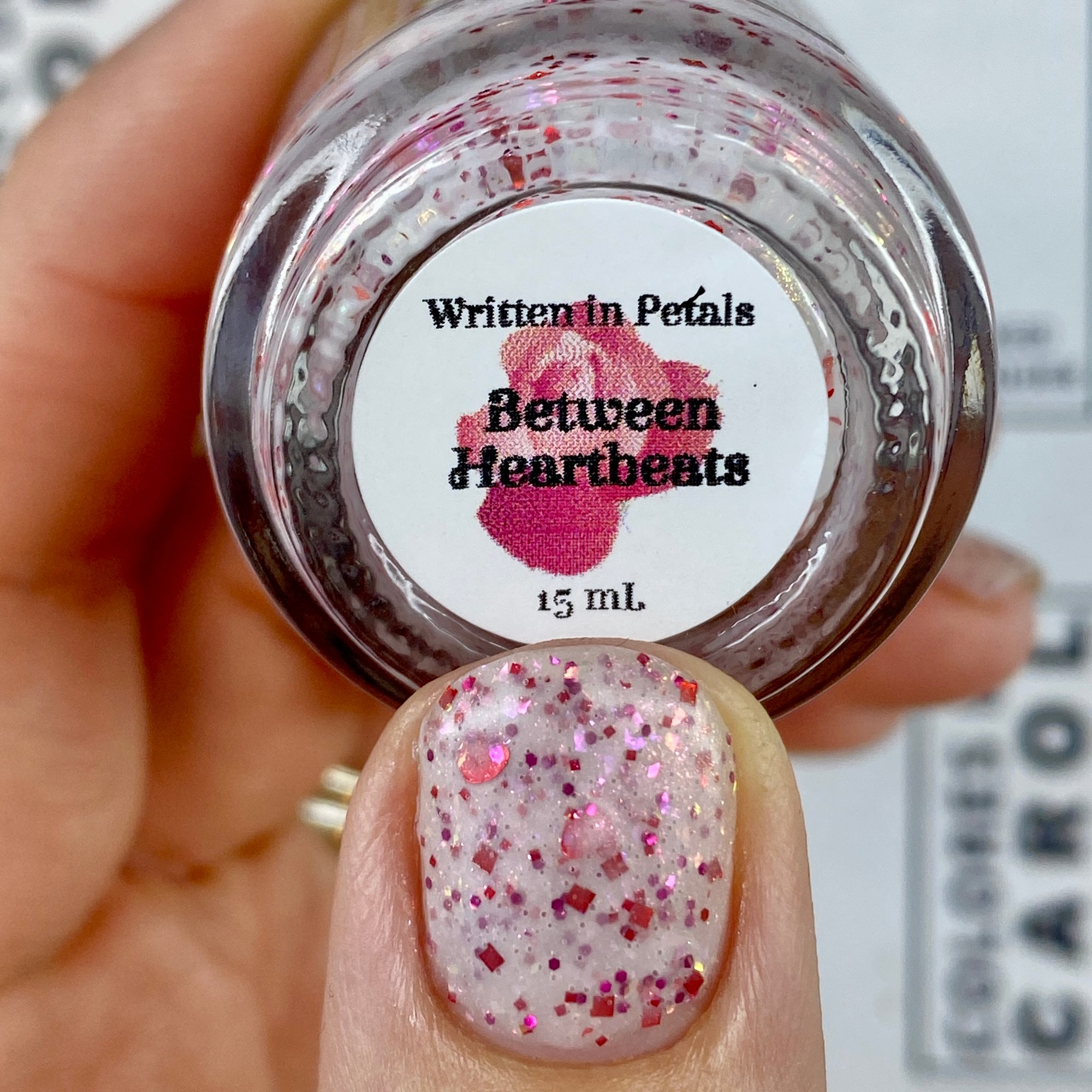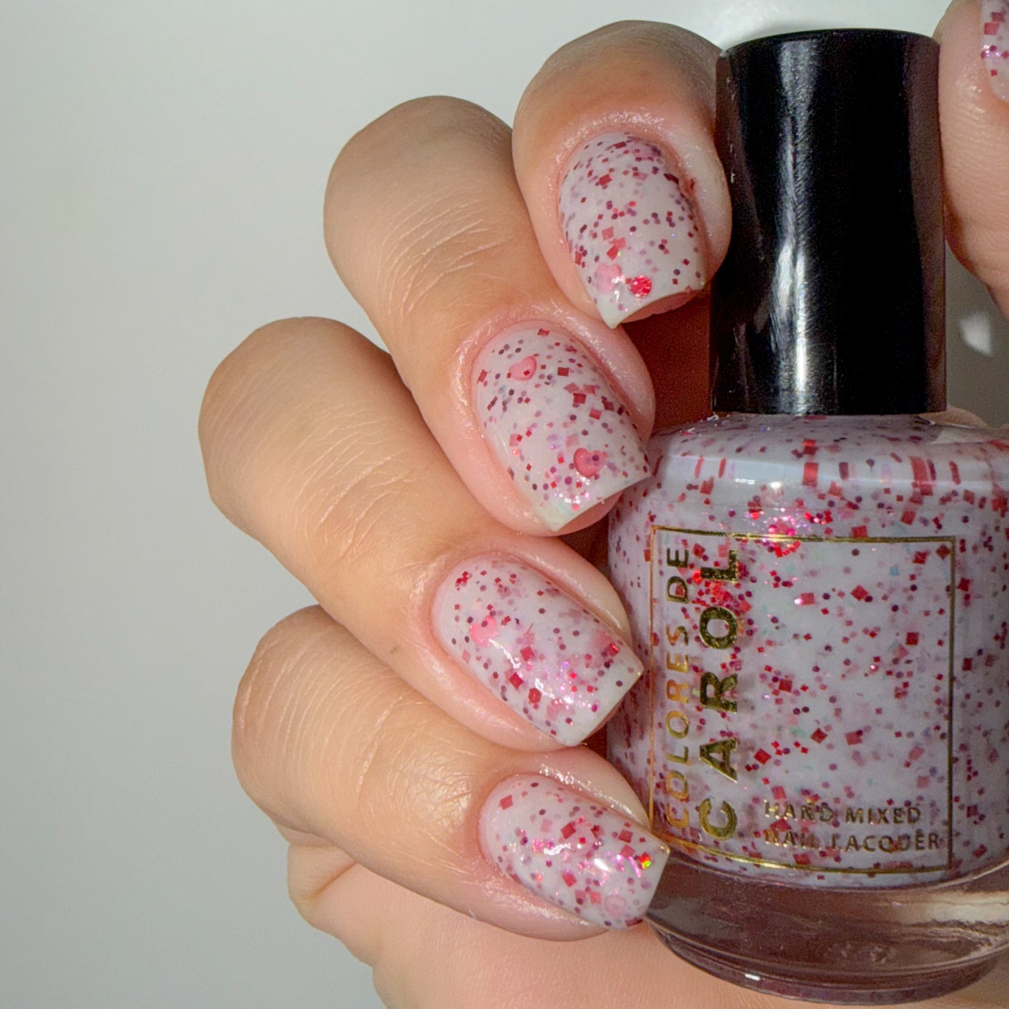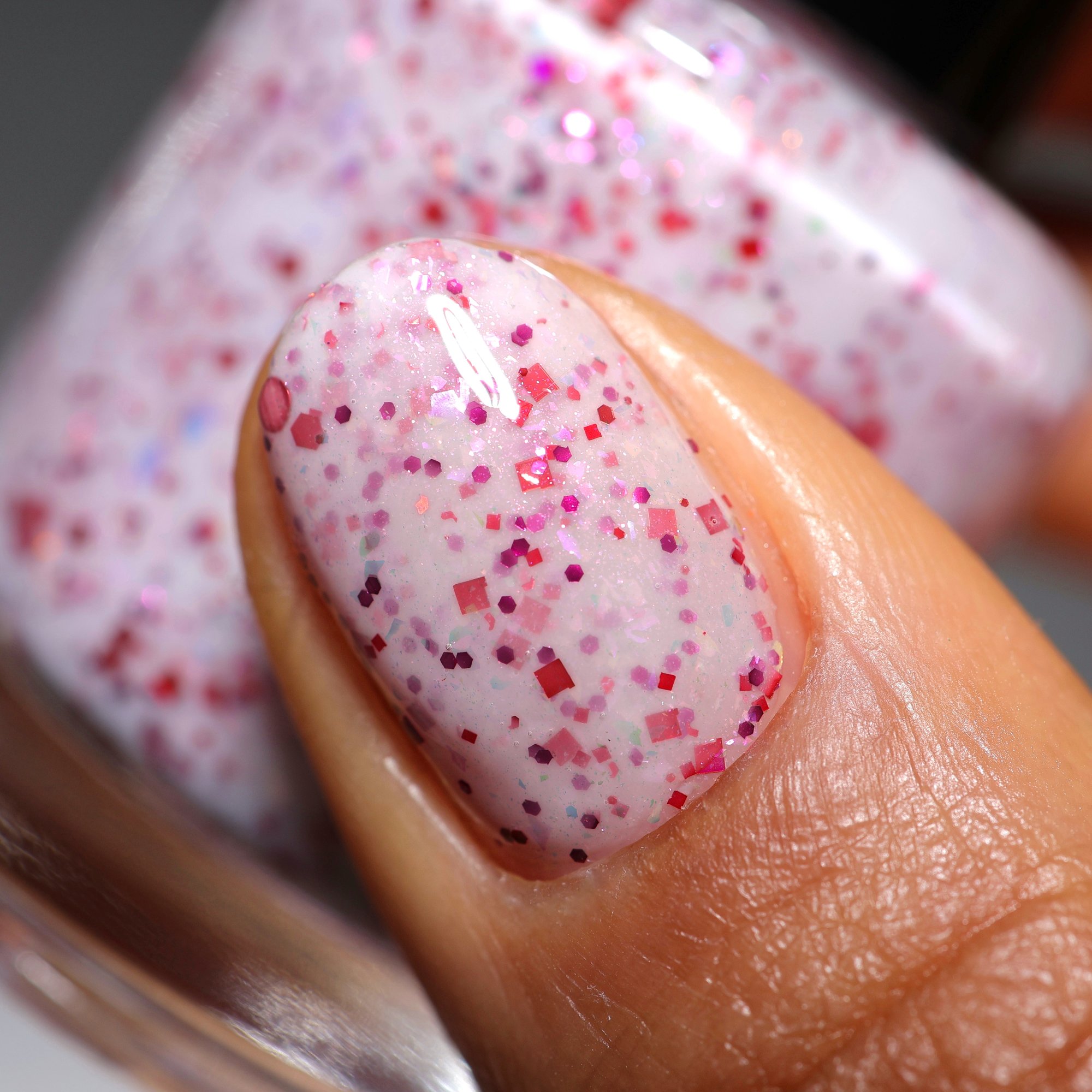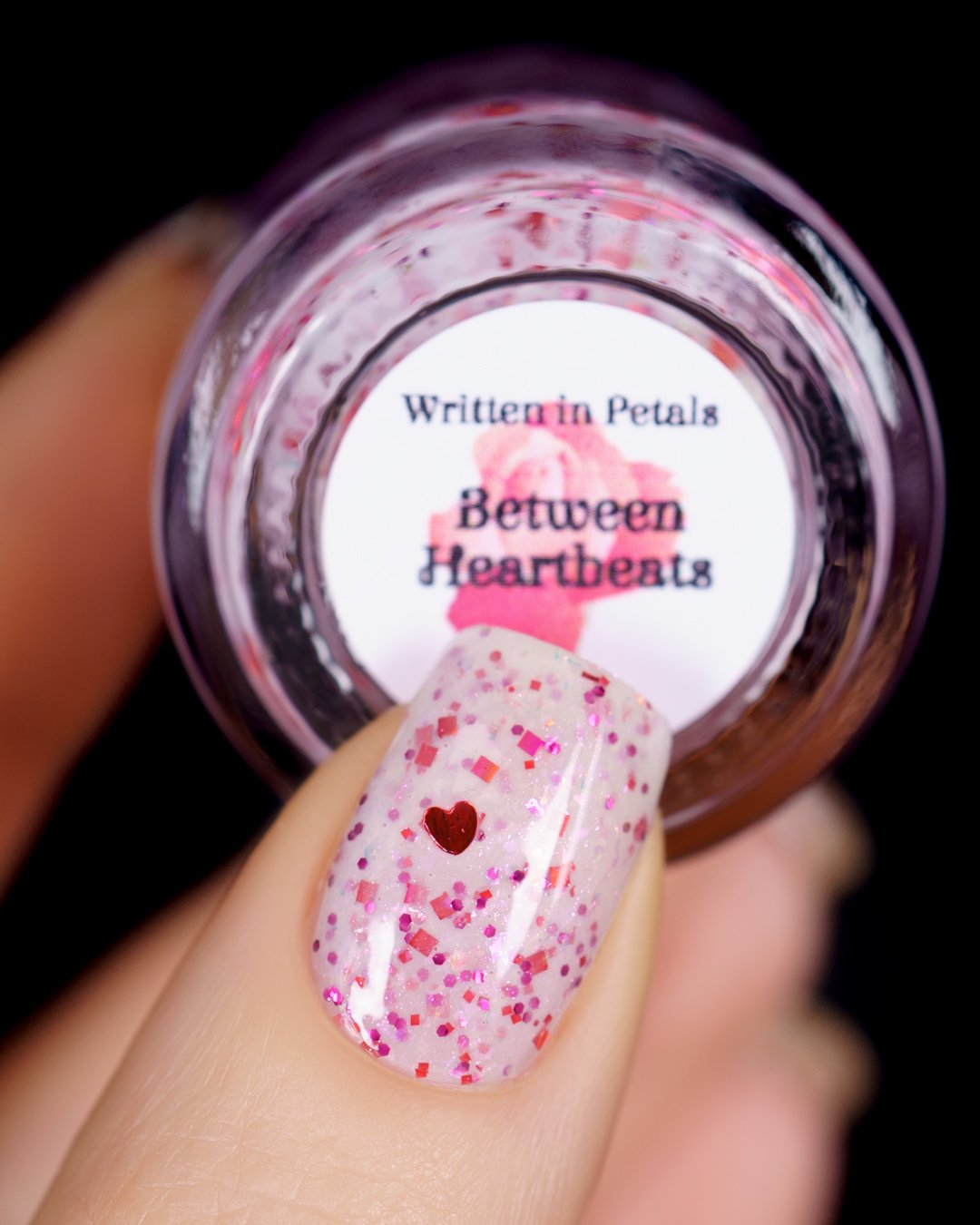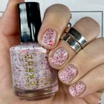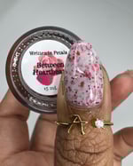 BETWEEN HEARTBEATS - A white crelly with a soft pastel Aurora shimmer that shifts between pink/gold, packed with red glitter in various shapes and sizes and iridescent chameleon flakes.