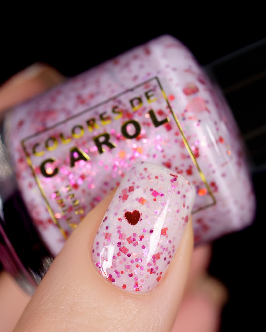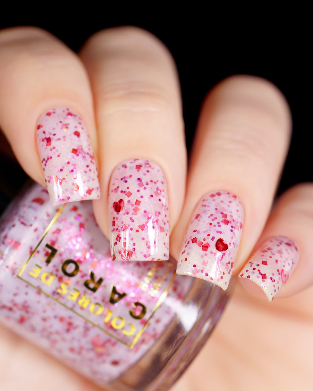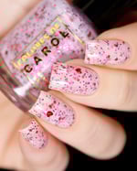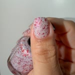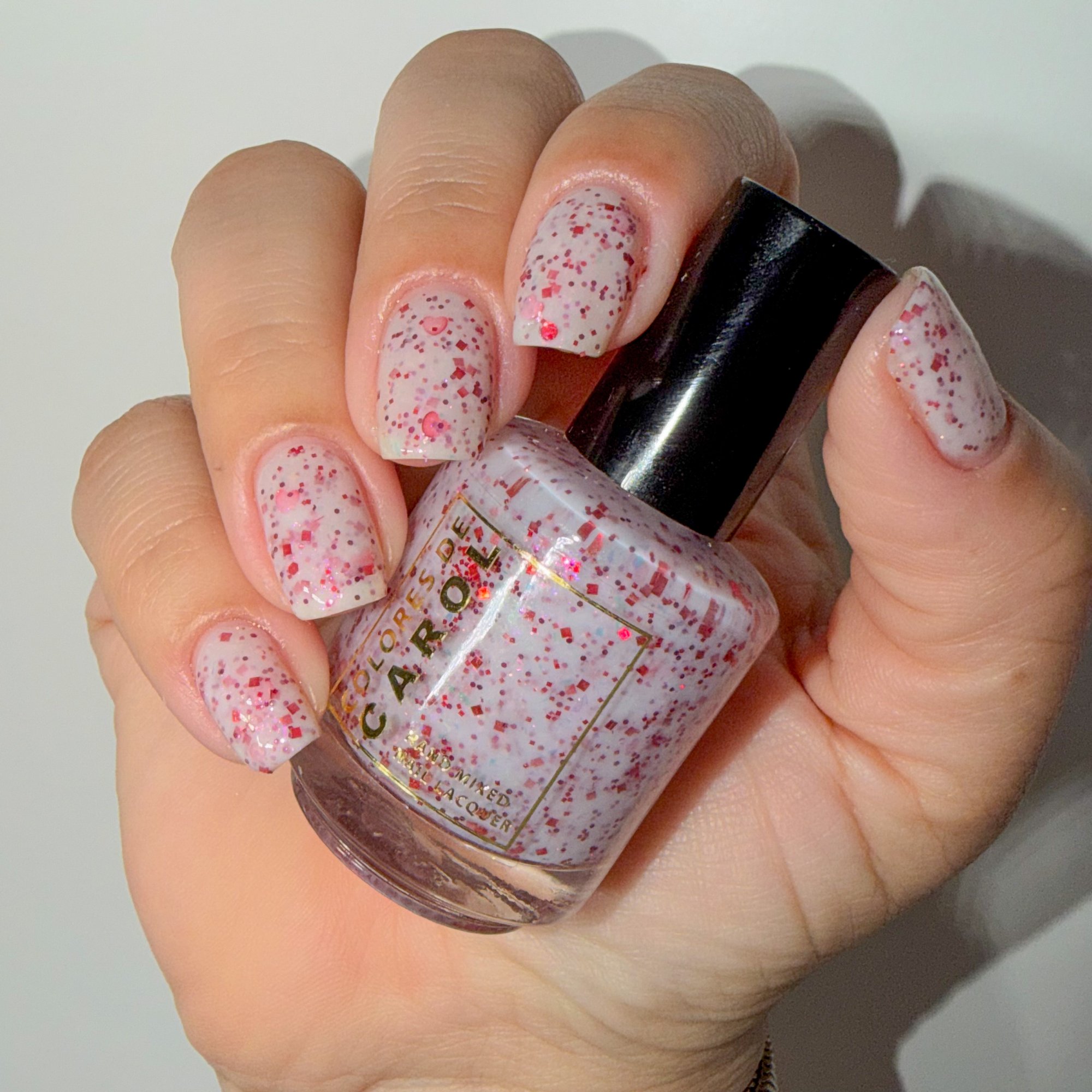 BETWEEN HEARTBEATS - A white crelly with a soft pastel Aurora shimmer that shifts between pink/gold, packed with red glitter in various shapes and sizes and iridescent chameleon flakes.