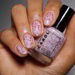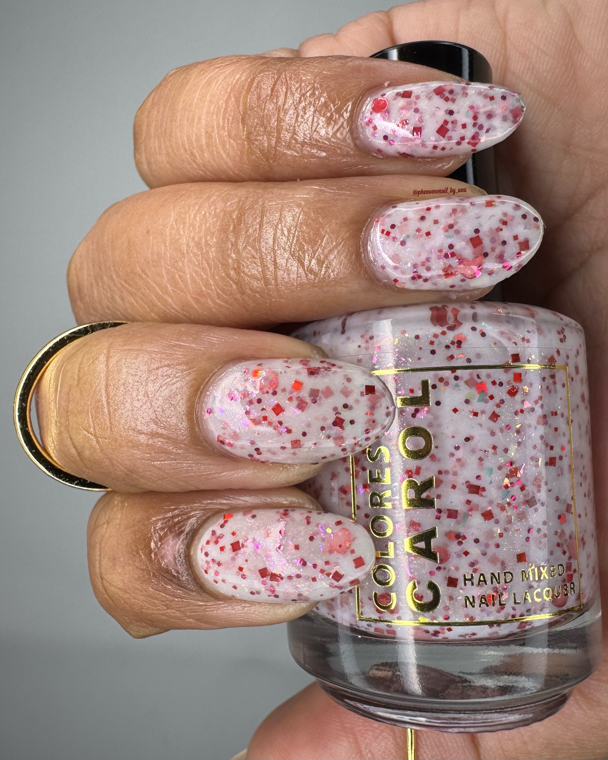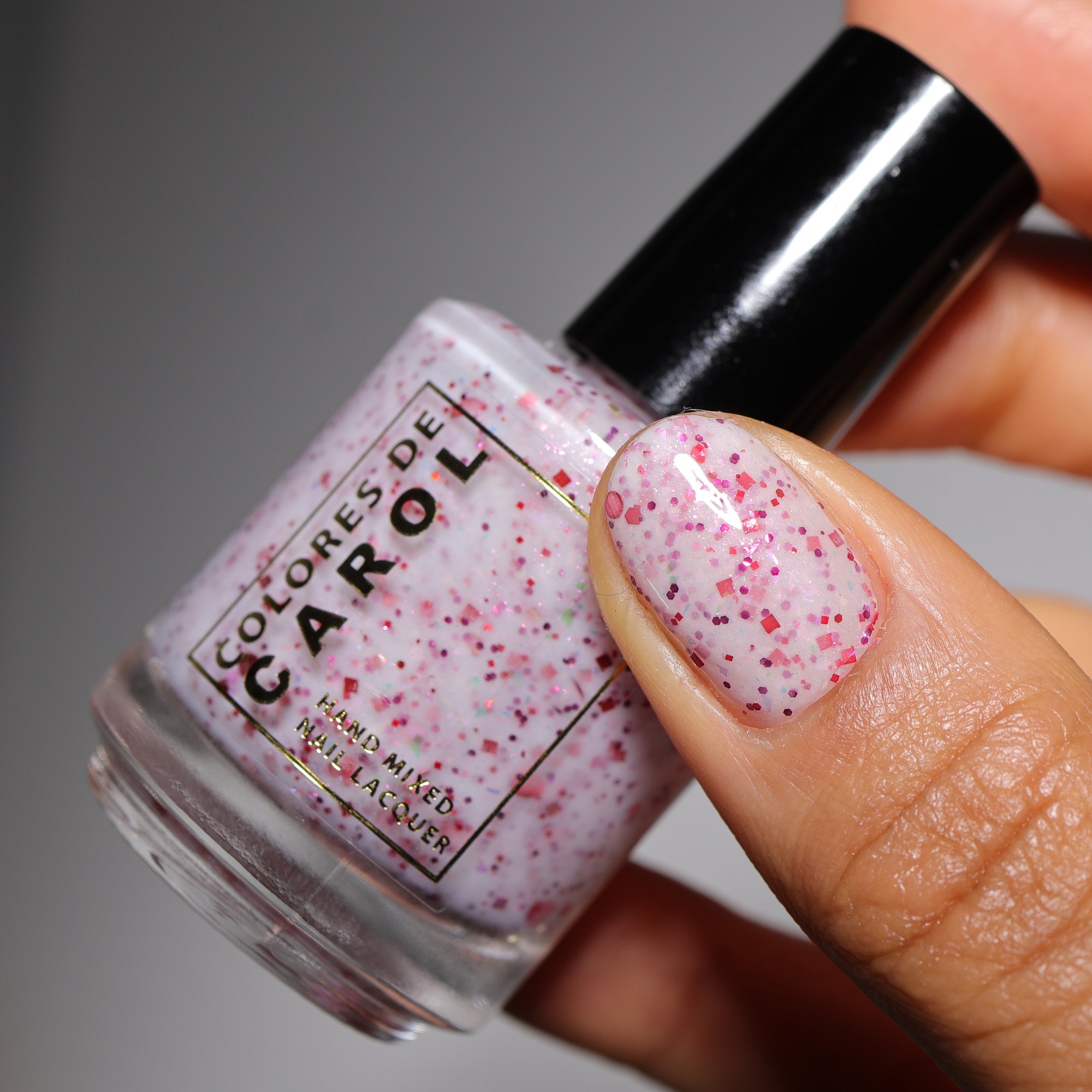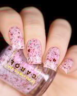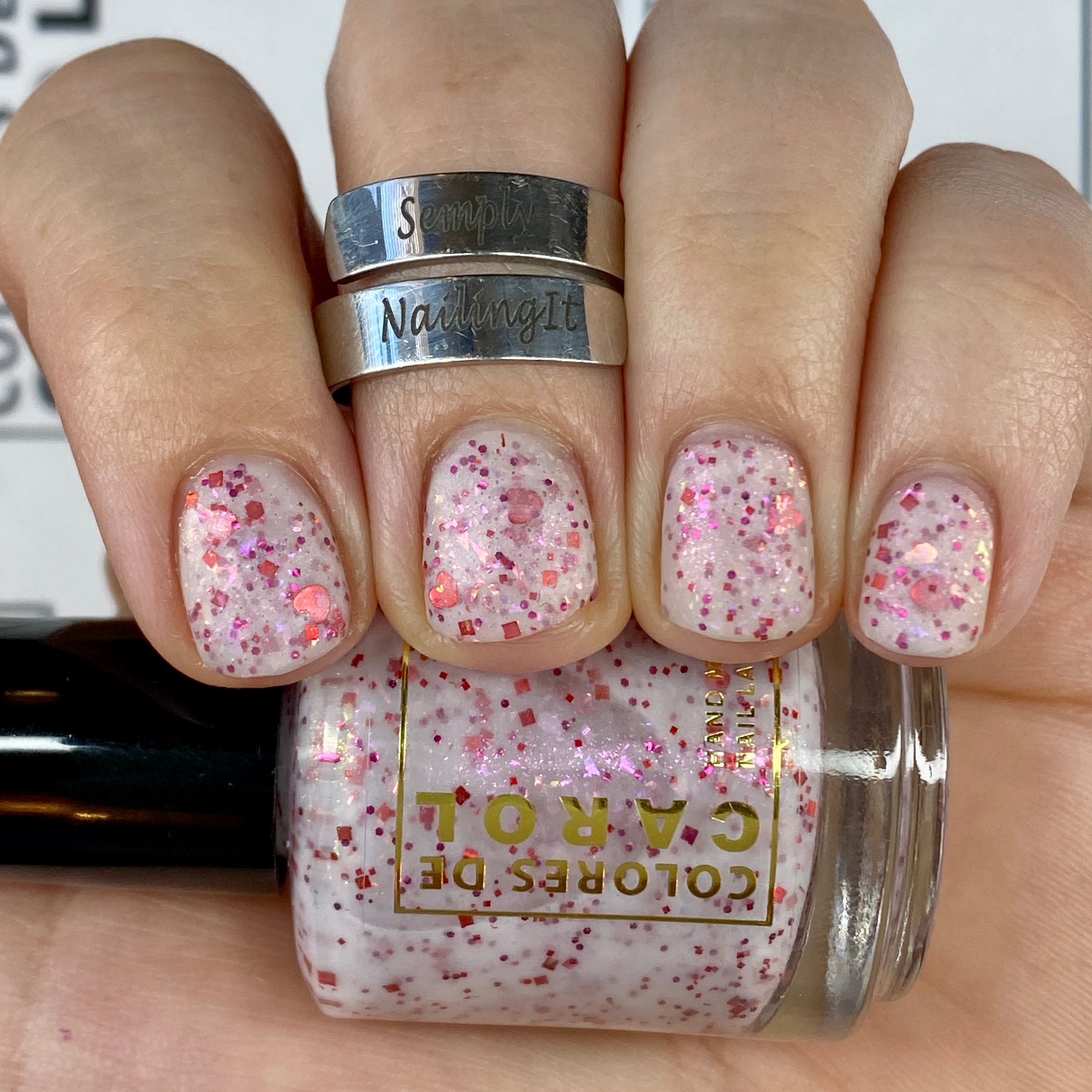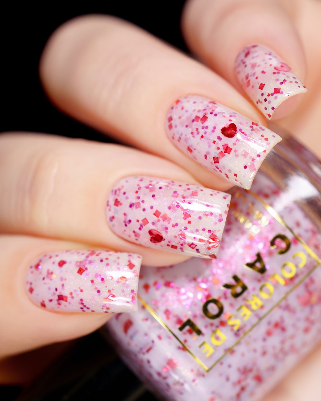 BETWEEN HEARTBEATS - A white crelly with a soft pastel Aurora shimmer that shifts between pink/gold, packed with red glitter in various shapes and sizes and iridescent chameleon flakes.