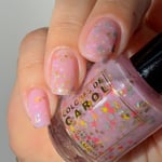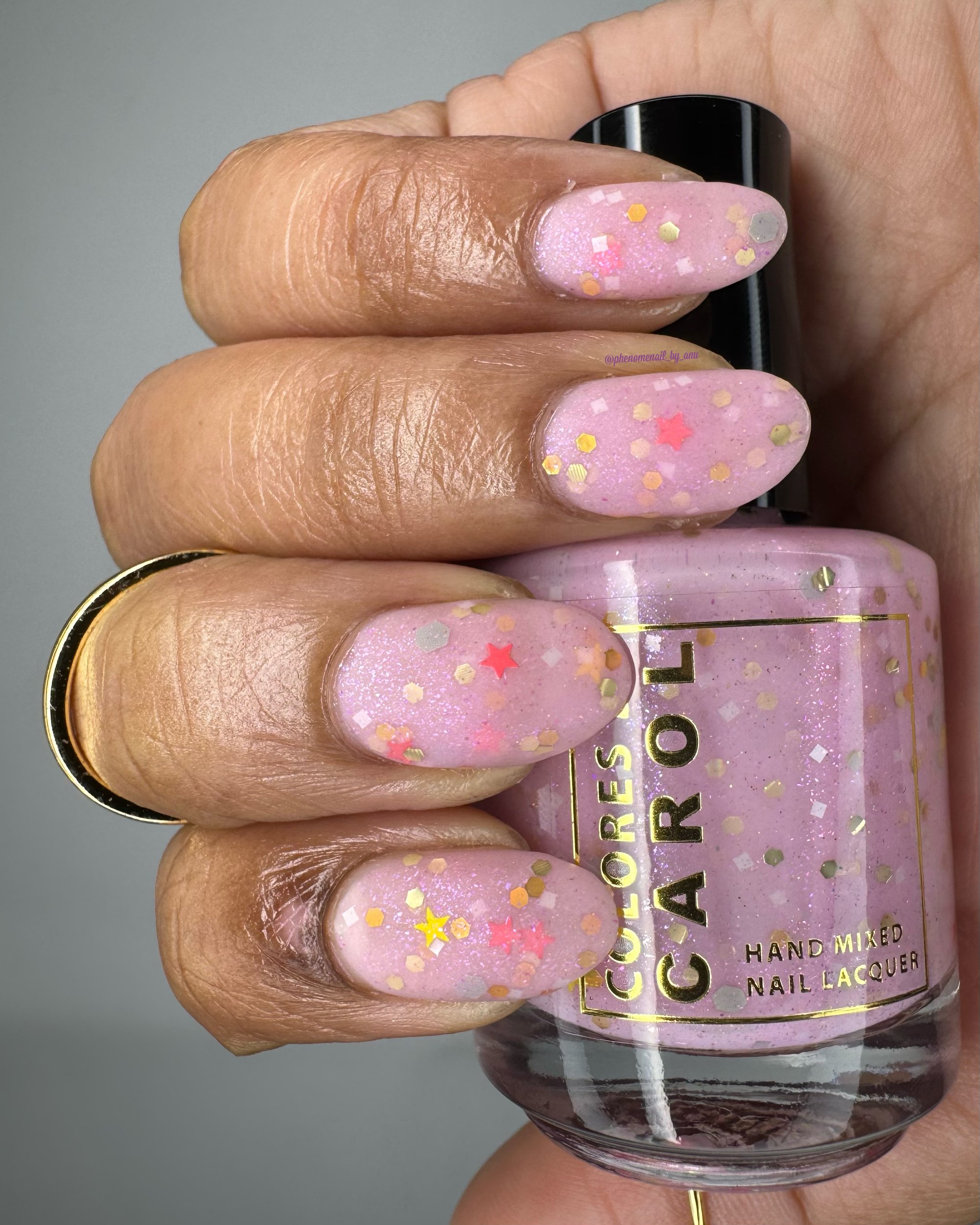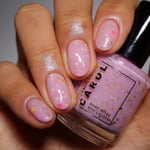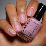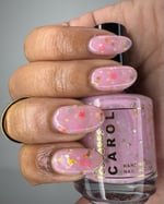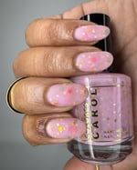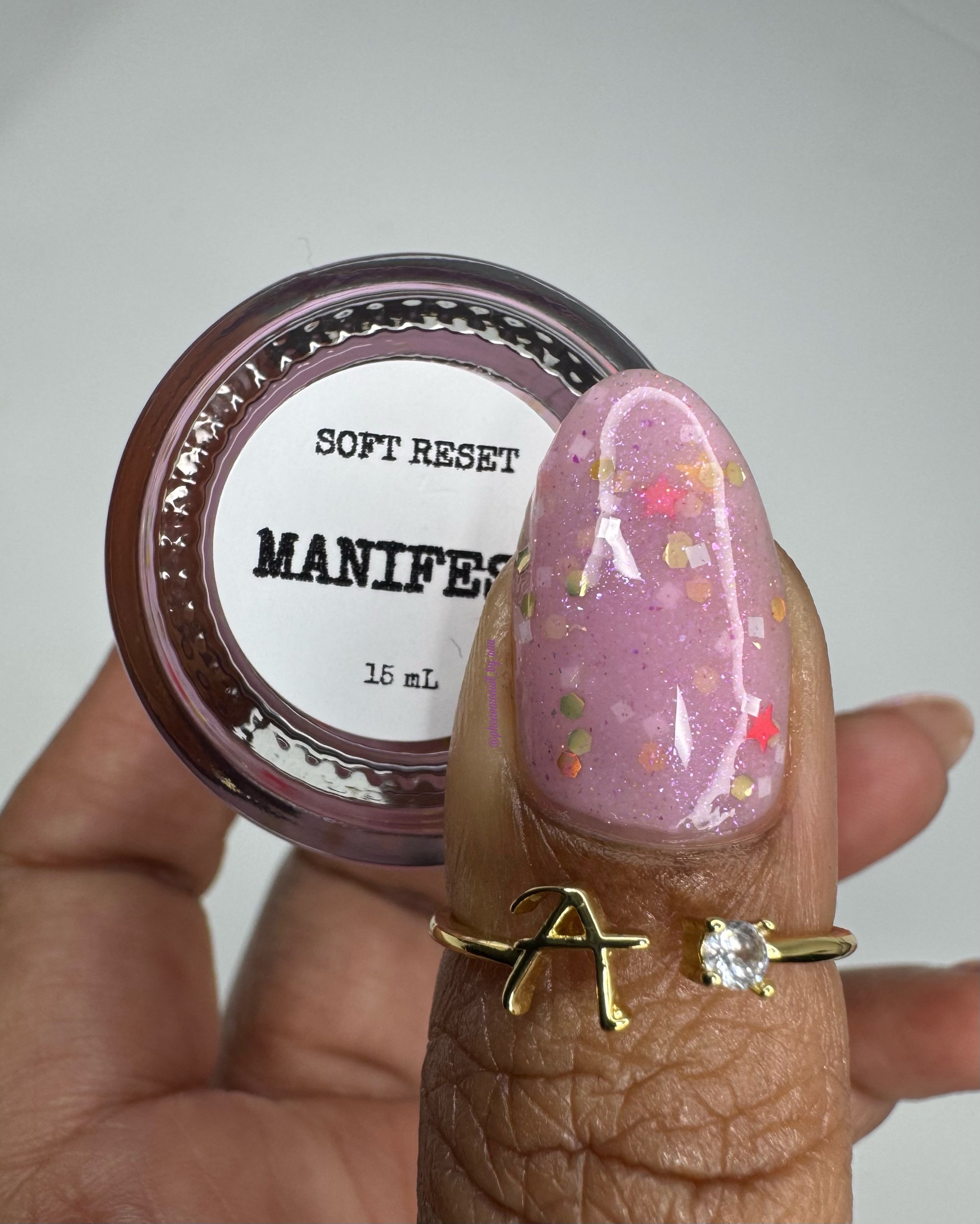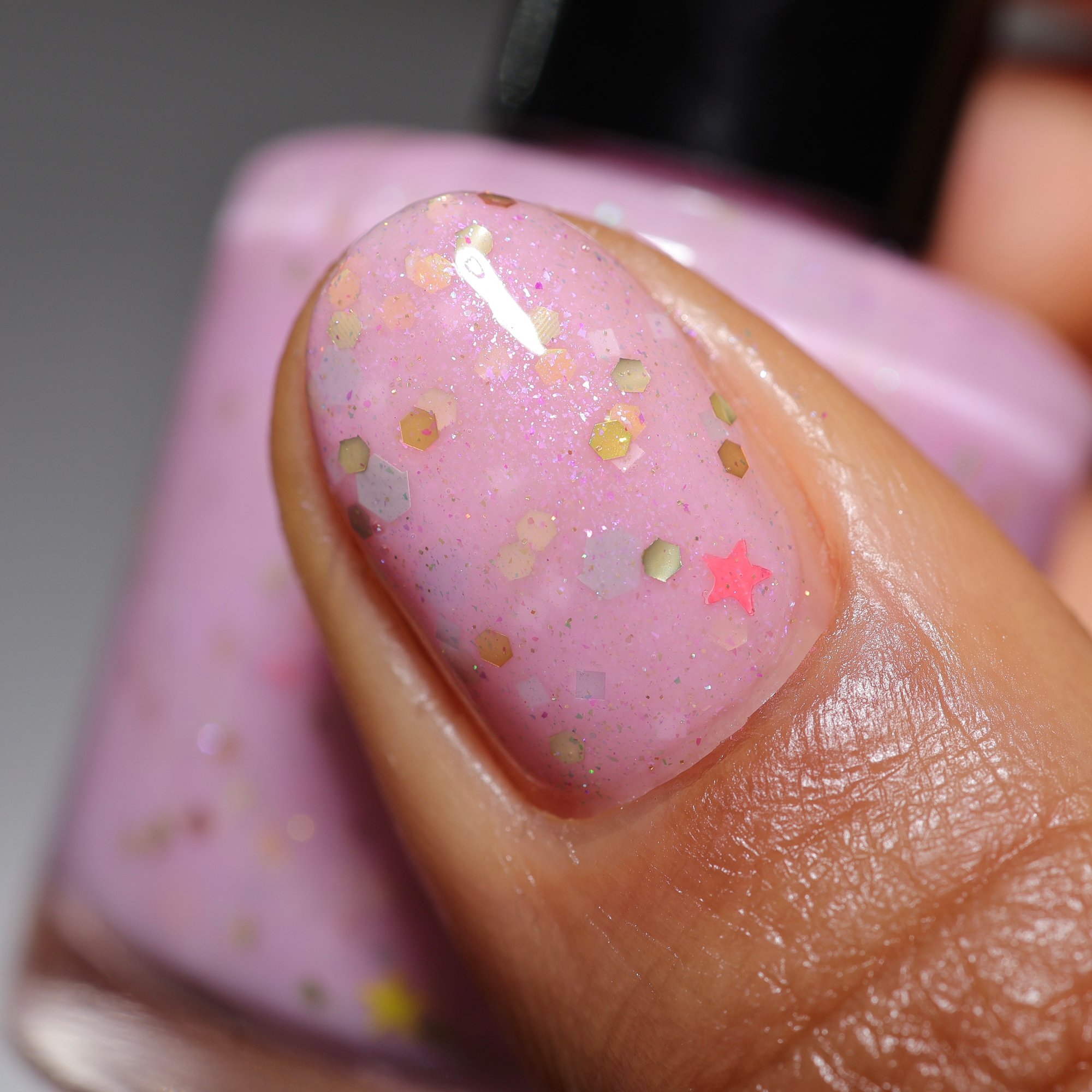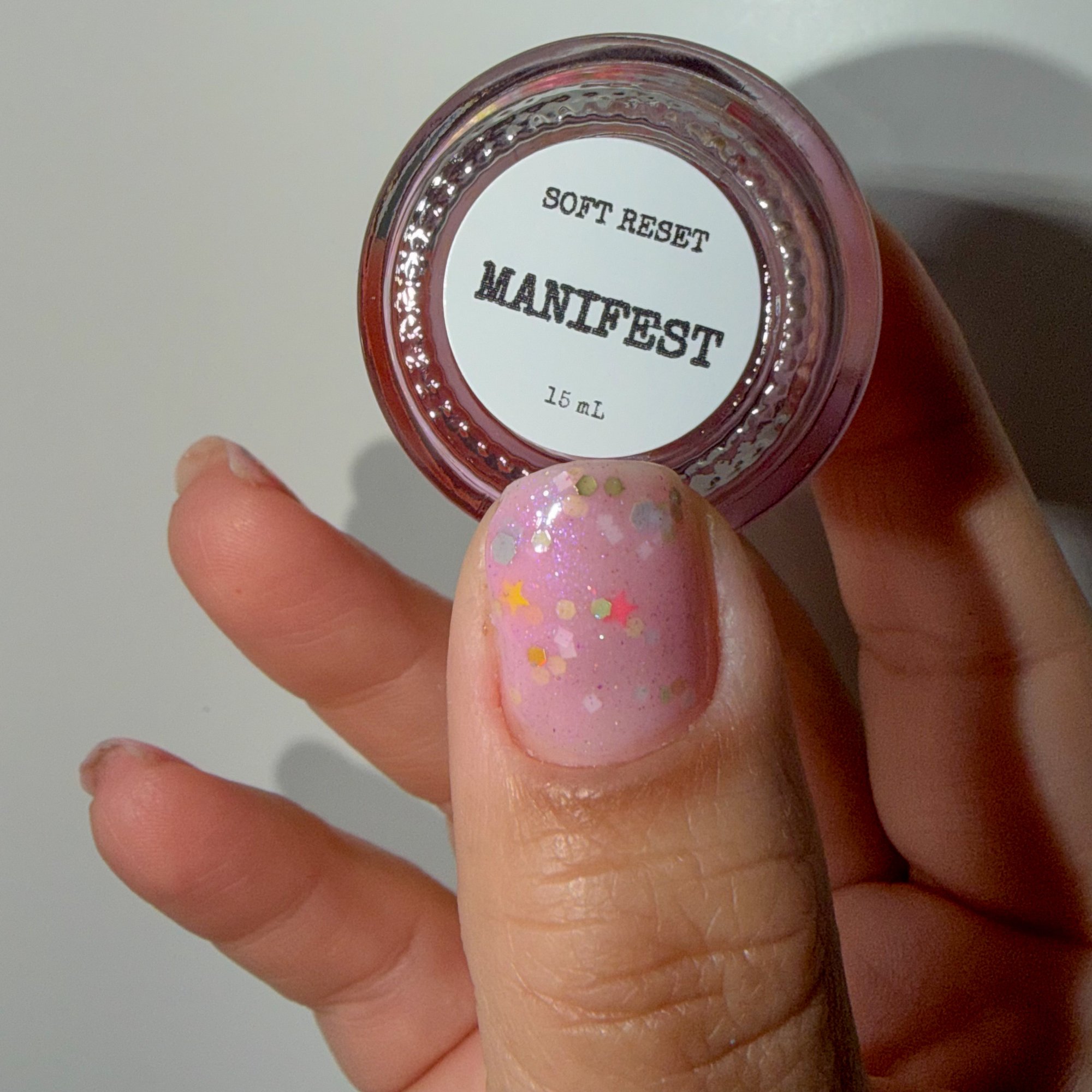 MANIFEST - a soft pink crelly with holo chameleon glitter, yellow and watermelon mini stars and grey hex matte glitter.