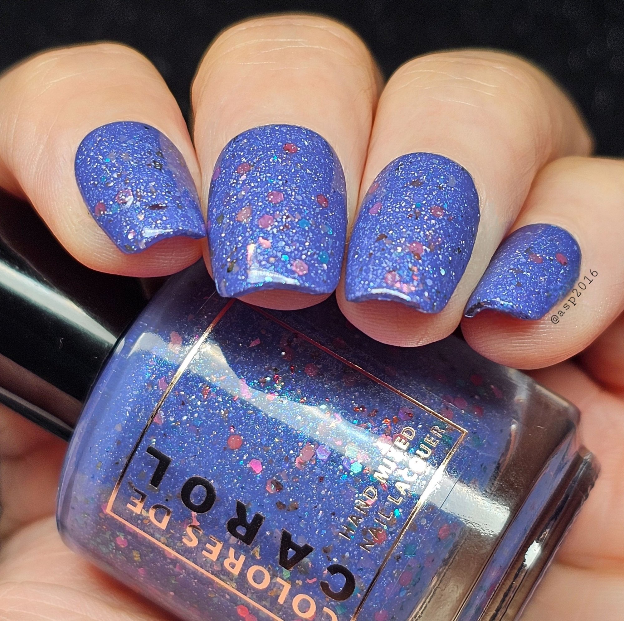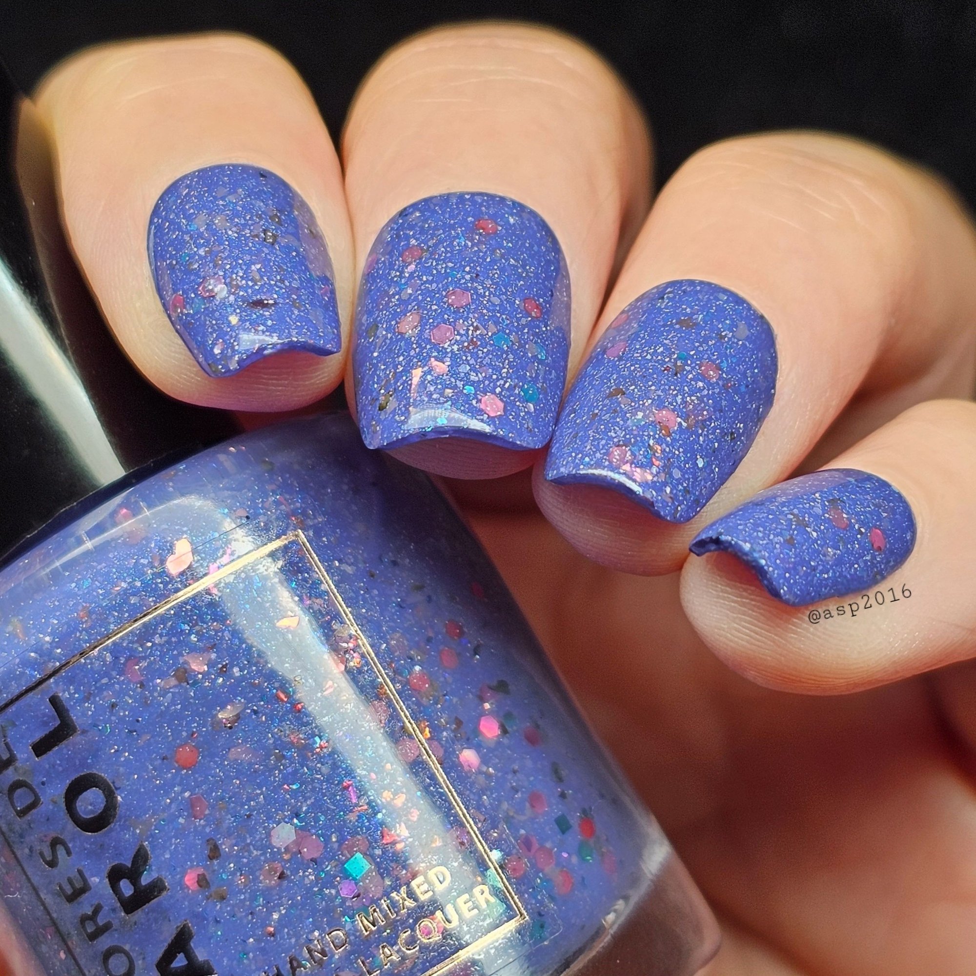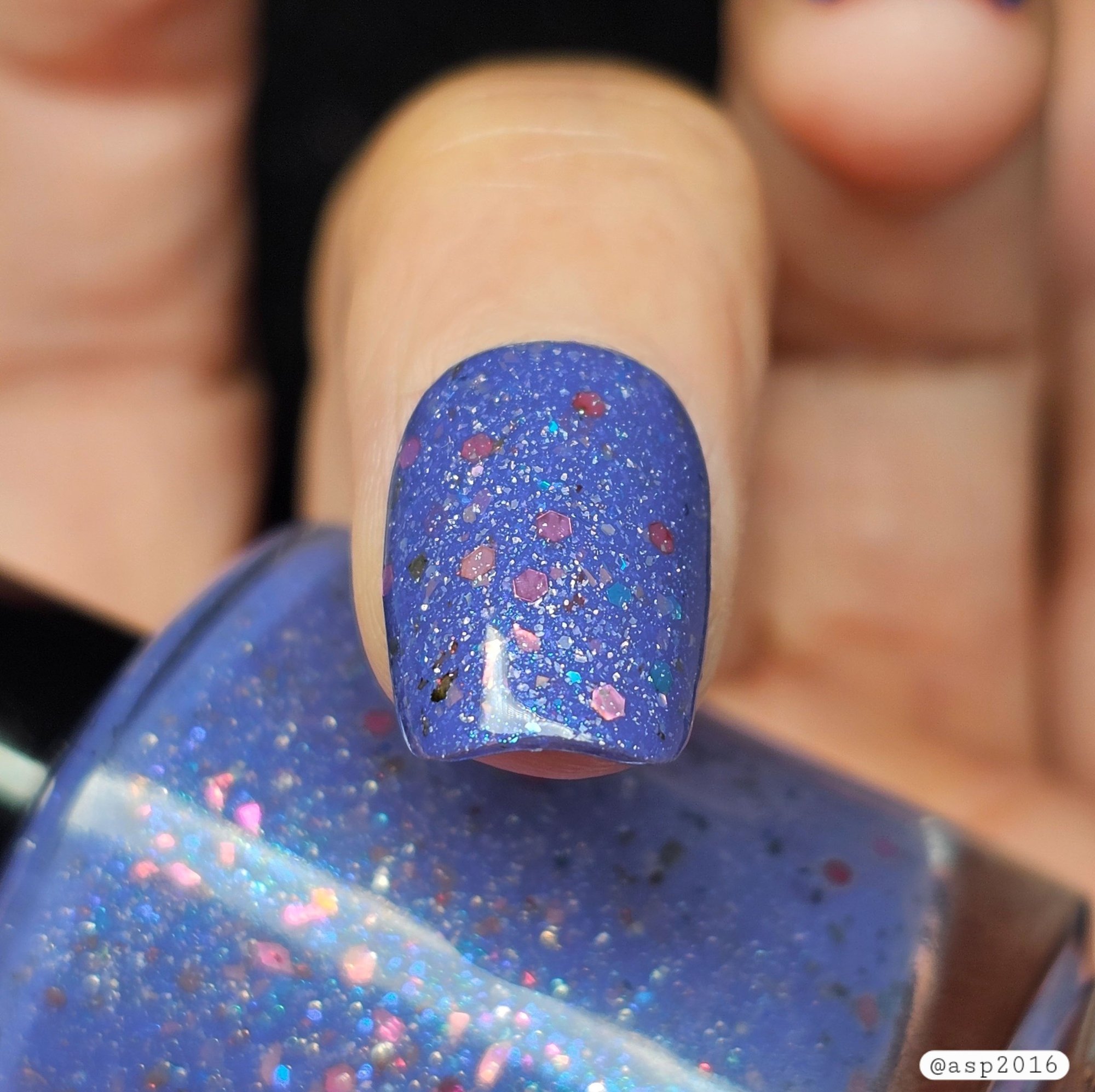 A soft lilac crelly base filled with a magical mix of copper, metallic blue, and iridescent hexagonal glitters, metallic blue squares, large copper and iridescent flakies, plus a touch of silver holo flakies. The result is a delicate yet powerful polish that shines with hope and connection.