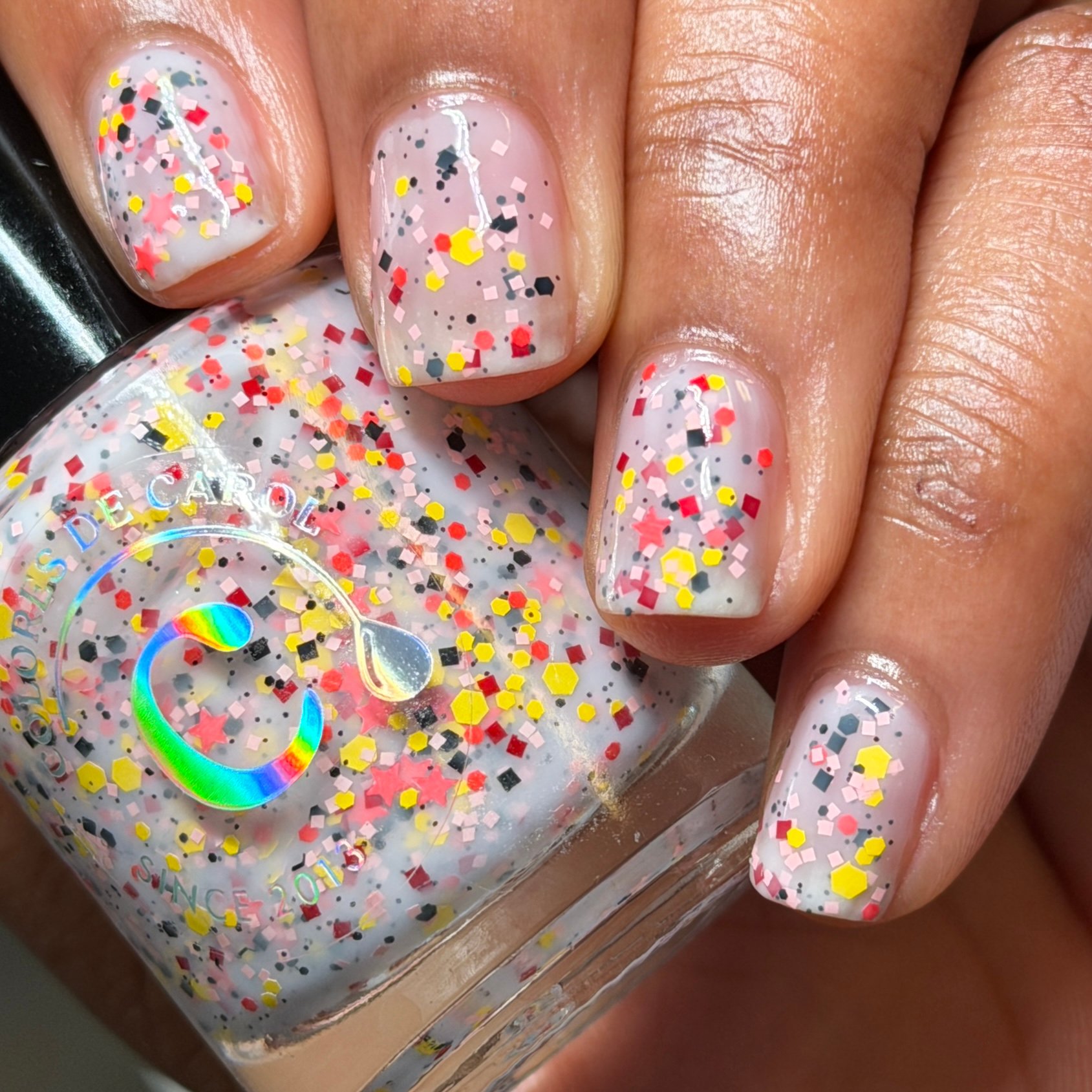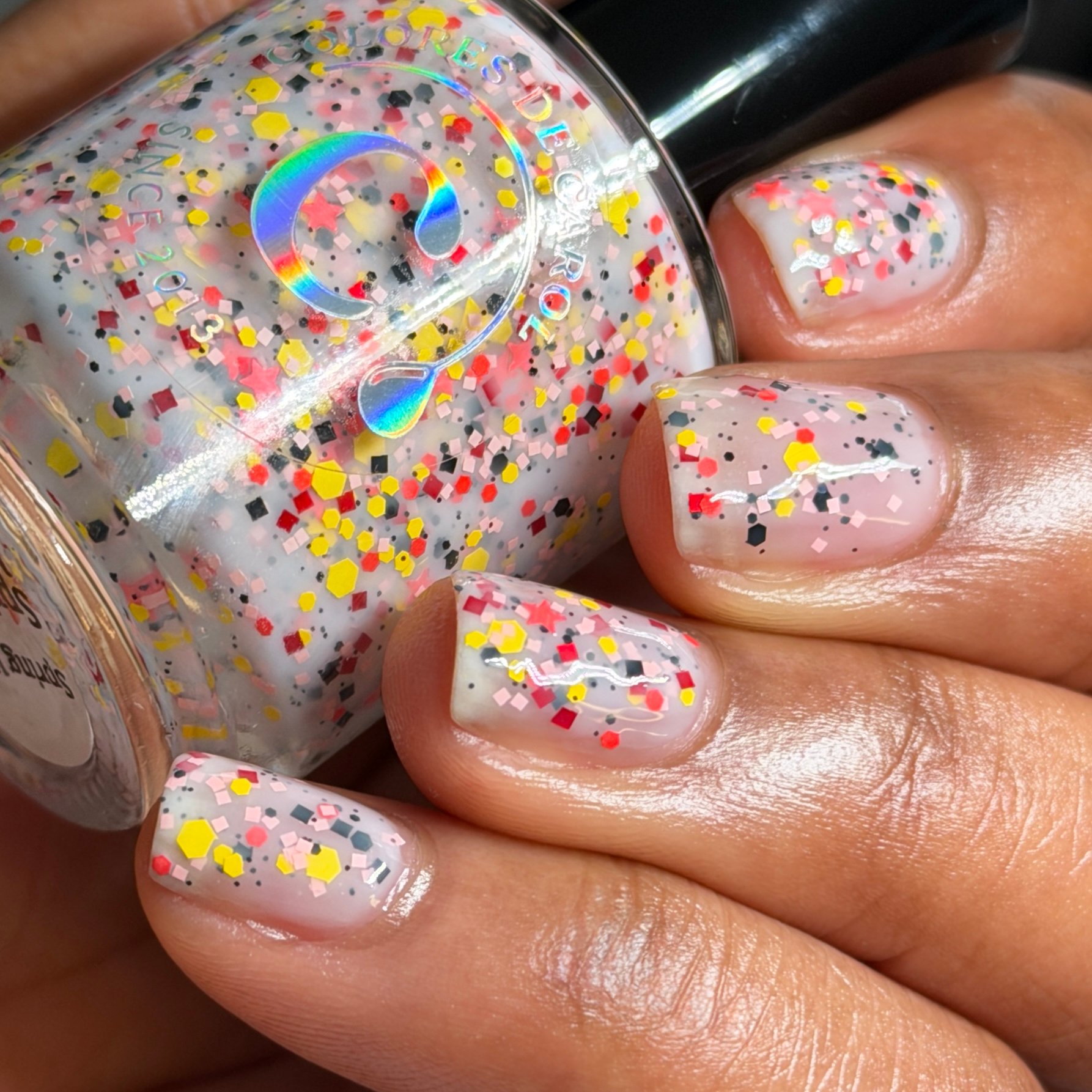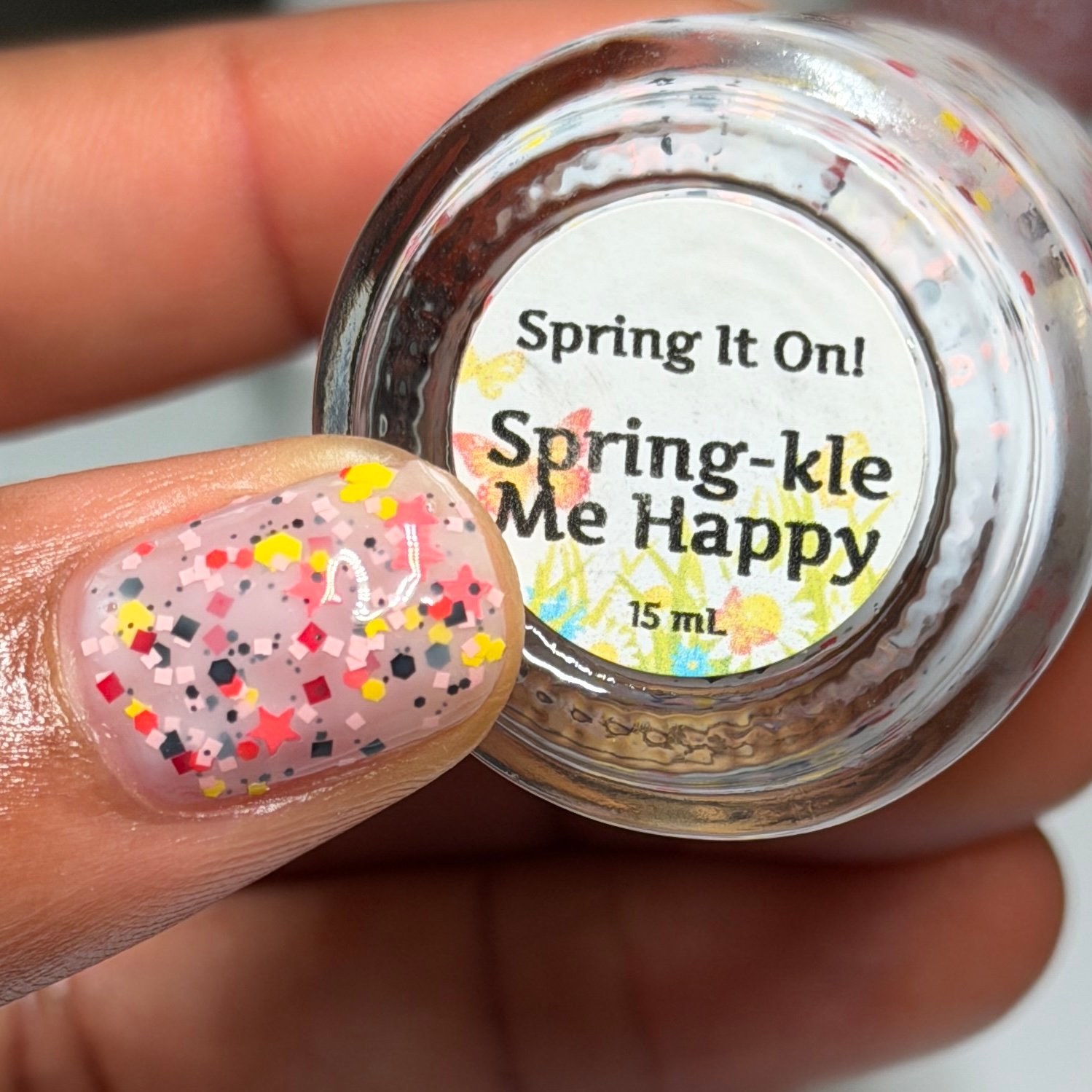 A soft white milky base filled with playful spring confetti in pastel pink, yellow, orange, black and red. This cheerful topper looks like a garden party on your nails, bringing a fun sprinkle of color that instantly brightens any manicure.